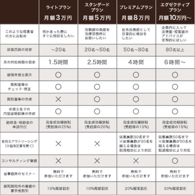 *上記は目安となります。従業員規模、対応内容などによって費用は変動いたします。また、顧問契約締結中の企業様に置かれましては、一定程度減額して対応させていただくこともございます。初回相談は1時間まで無料とさせていただいておりますので、お気軽にご連絡ください。 |